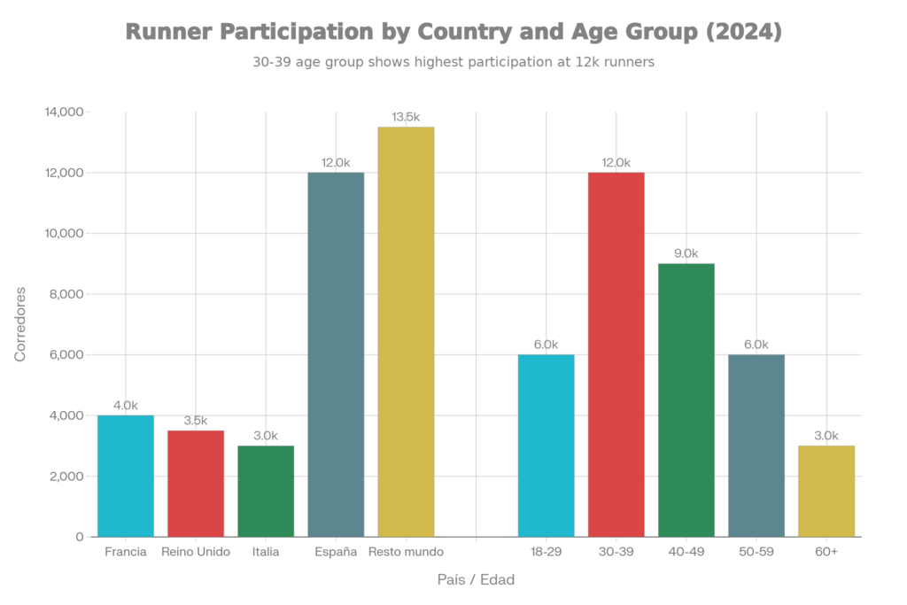 A nivel de edades, el grueso del pelotón se concentra entre los 30 y 49 años, que agrupan la mayoría de los dorsales, con menor pero significativa presencia de corredores jóvenes (18–29) y veteranos de más de 60 años. La siguiente gráfica resume de forma estimada la distribución por países y franjas de edad en 2025, basada en los datos globales de participación disponibles.